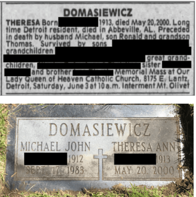 The Foundation also discovered another registrant who, if alive today, would be 108 years old. She also died over two decades ago. The Foundation also found her obituary in the Detroit Free Press and her gravestone online.