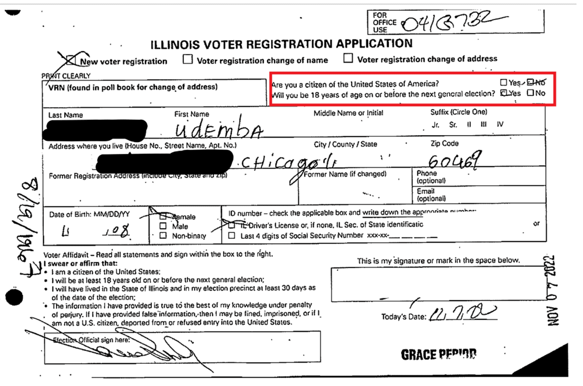 For example, some of these foreign nationals even informed election officials on the voter registration form that they were not United States Citizens but were still registered by election officials anyway. See the form below.
